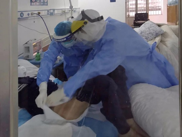 這位患者今年62歲,已經(jīng)病了好幾個(gè)月了,最初在鄉(xiāng)鎮(zhèn)衛(wèi)生院治療,后來檢測(cè)出來感染了新型冠狀病毒肺炎。縣醫(yī)院接管他的時(shí)候,病情已經(jīng)極其危重,大小便失禁,床上臊臭氣熏人,患者全身骨瘦如柴,動(dòng)則喘氣,吃不下東西。